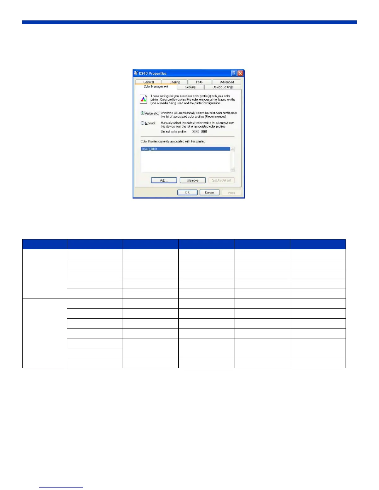The Color Management tab designates the color profile. Default profile at installation is [DS40_xxxx] where xxxx is a four-
