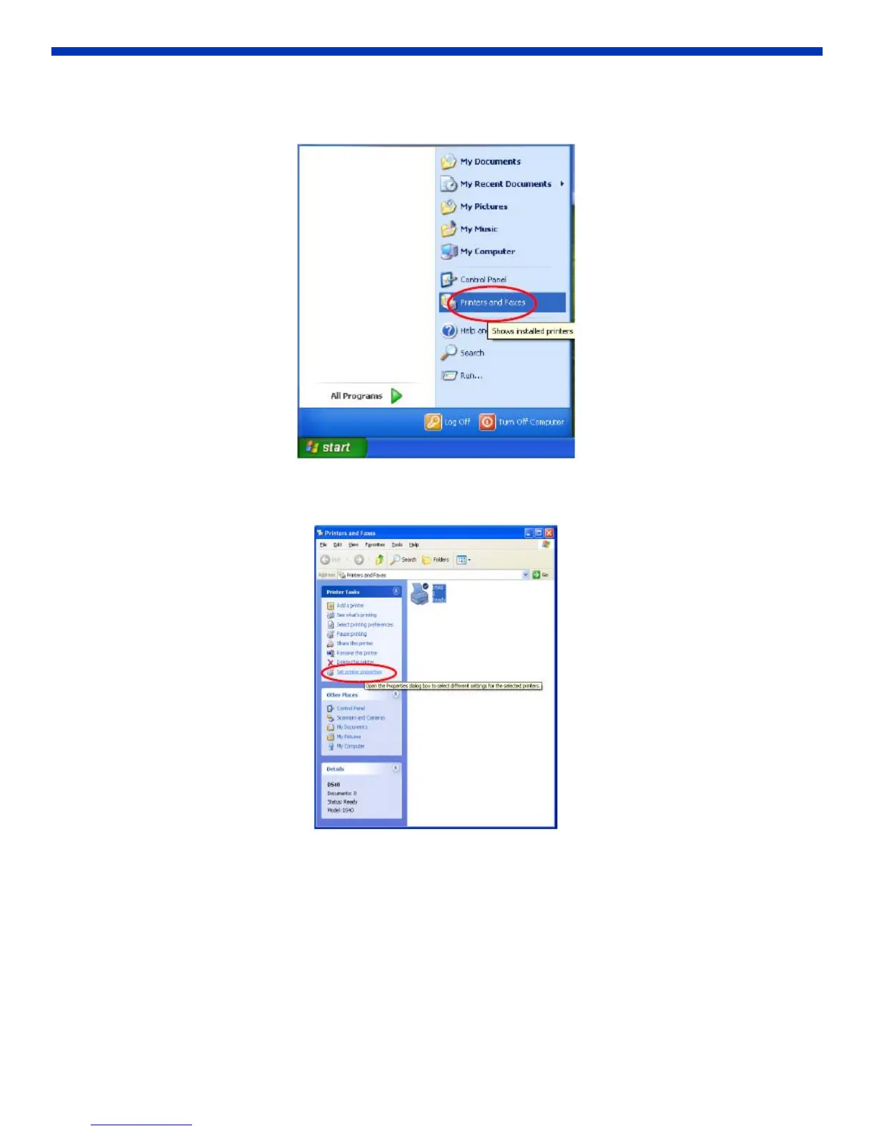 2. Select the DS40 printer. Click on Set printer properties in the Printer Tasks menu.