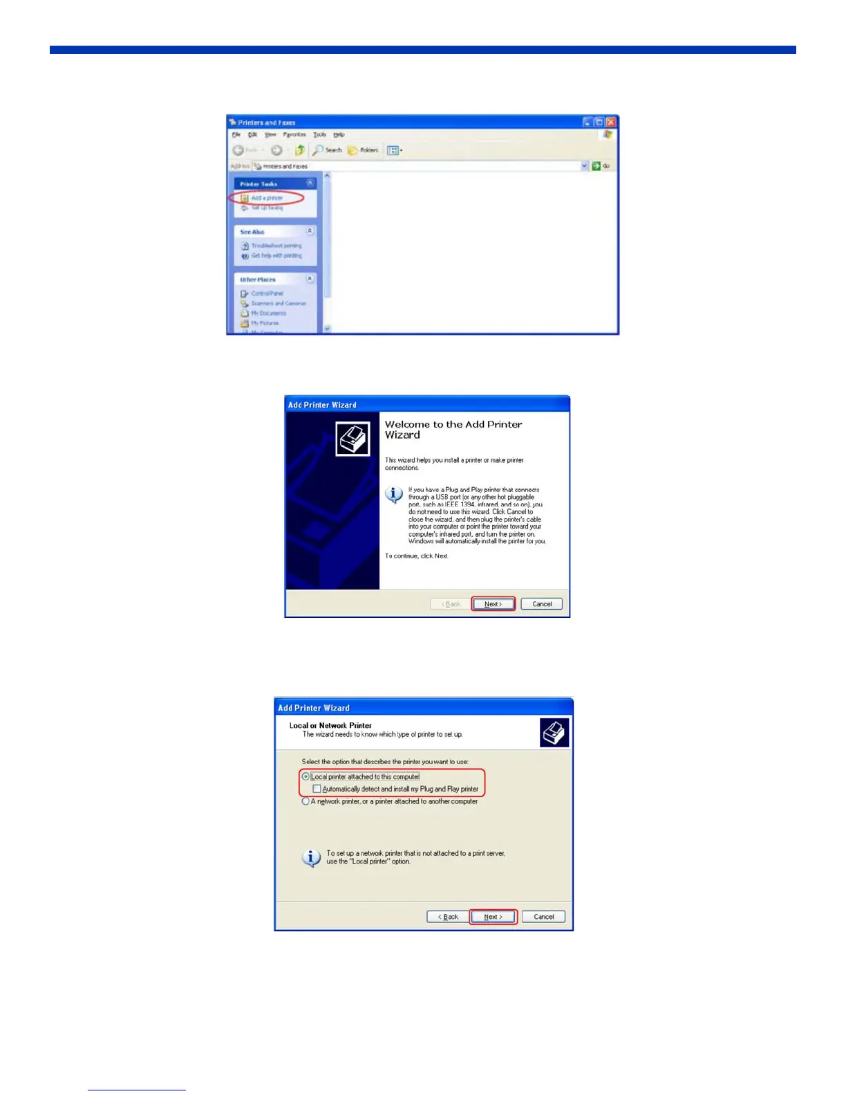 4. Select “Local printer attached to this computer”, and deselect “Automatically detect and install my Plug and Play