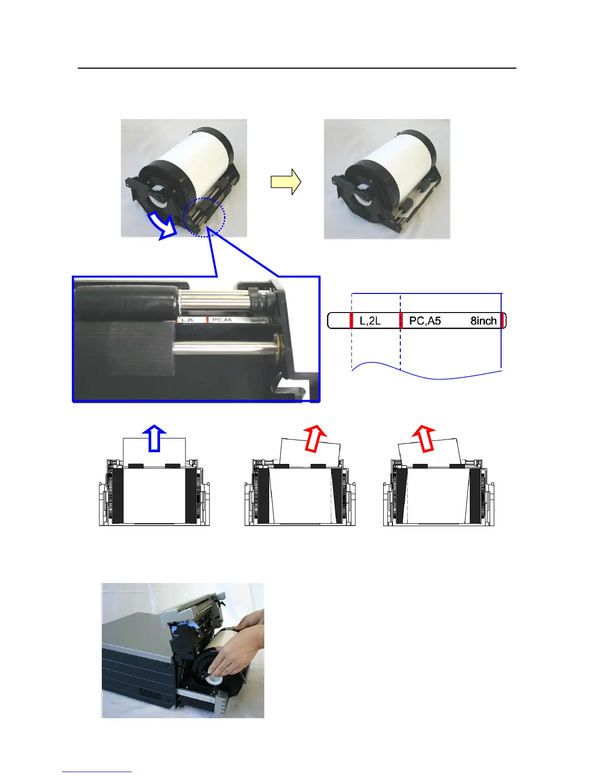 7. Remove the tape, and advance the roll as indicated by the arrow. Set the end of the paper about 5mm beyond