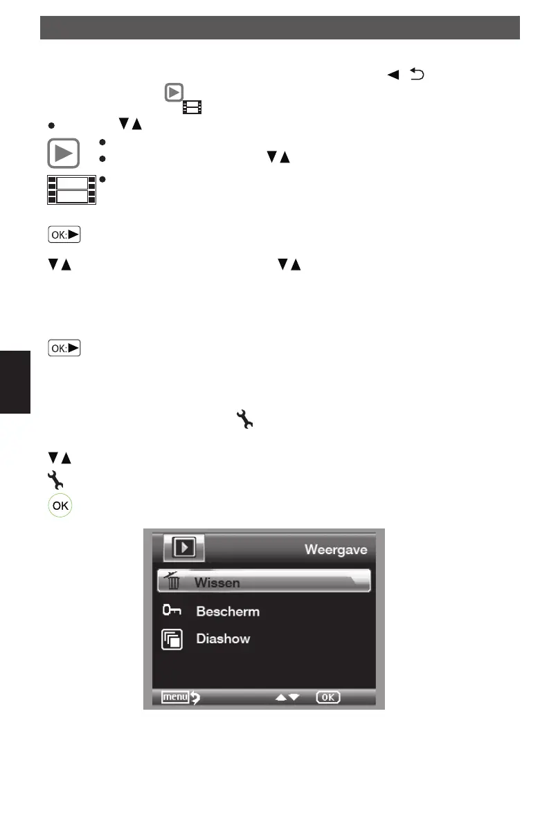 Tijdens de weergave heeft u toegang tot een menu met de volgende functies: wissen, bestands-