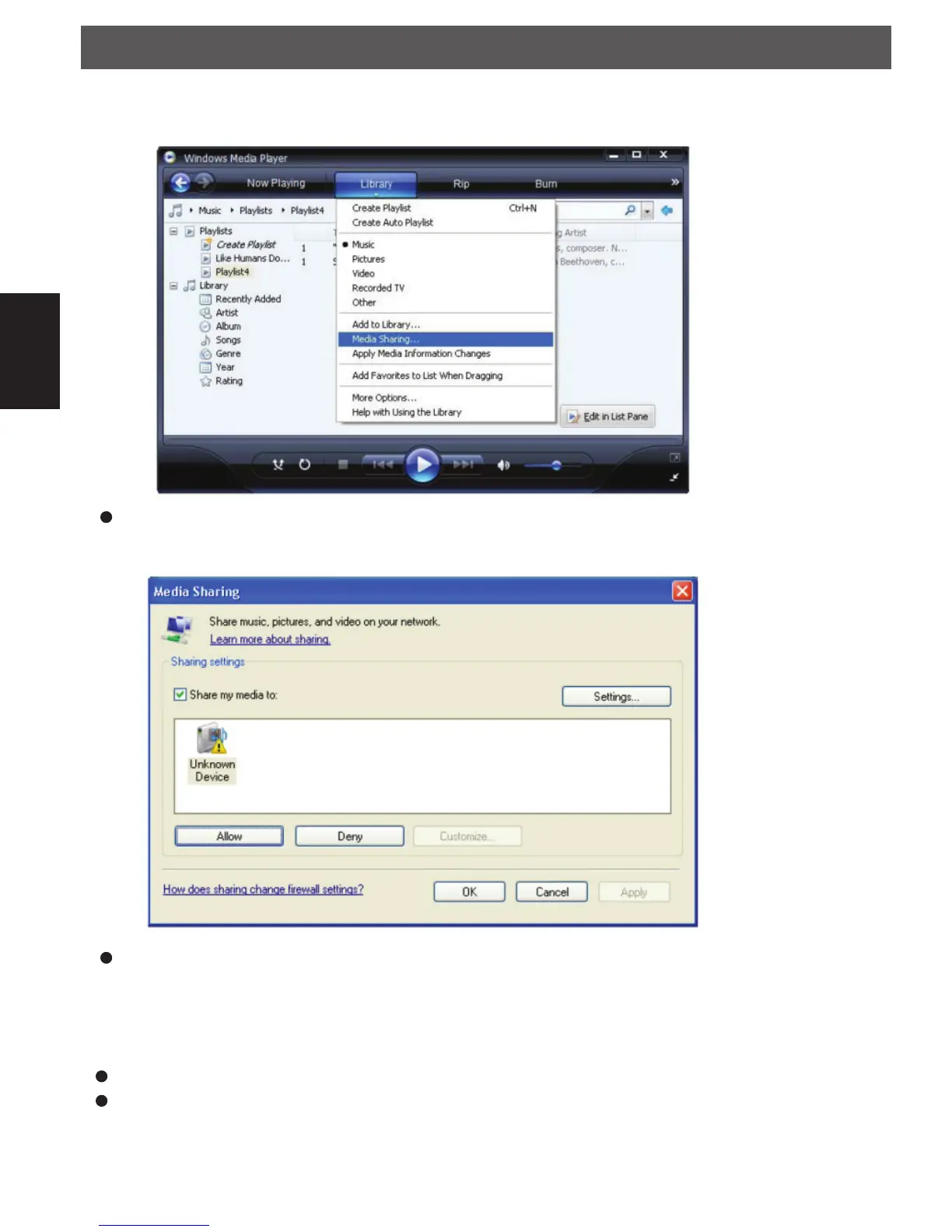 Selecting ‘Media Sharing…’ for Windows Media Player11 :