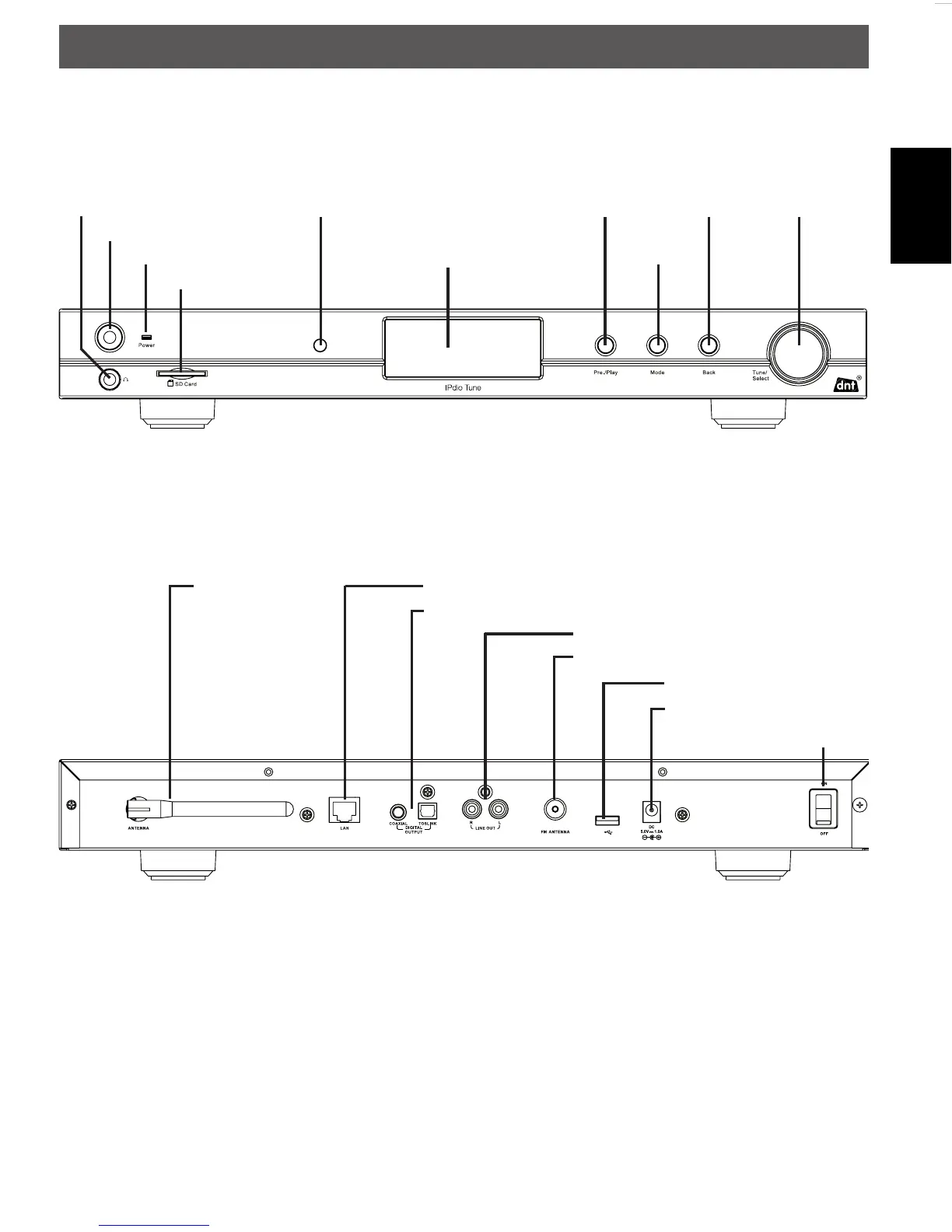 Kopfhöreranschluss Fernbedienungsensor Play/Pause Back Tune/Select