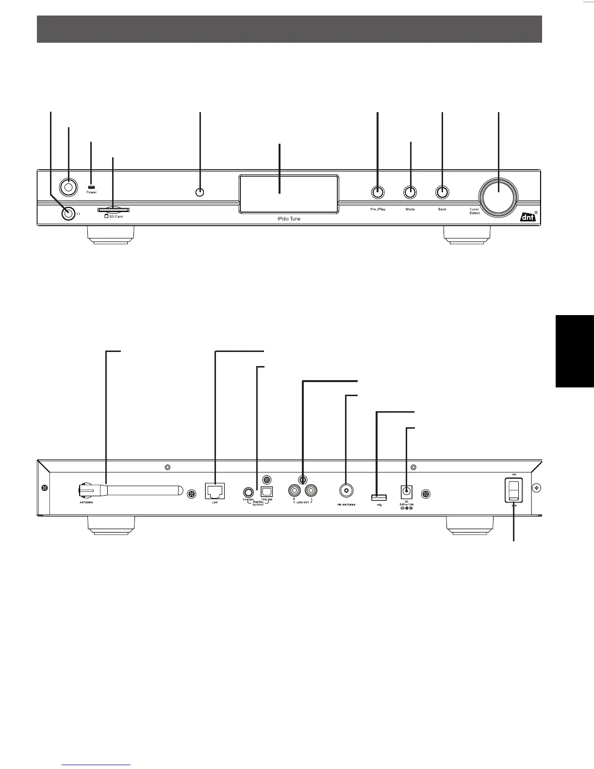 Raccordement pour casque Capteur de télécommande Lecture/Pause Retour Tune/Select