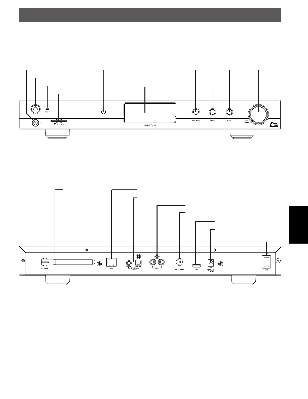 Hoofdtelefoonaansluiting Afstandsbedieningssensor Play/Pause Back Tune/Select