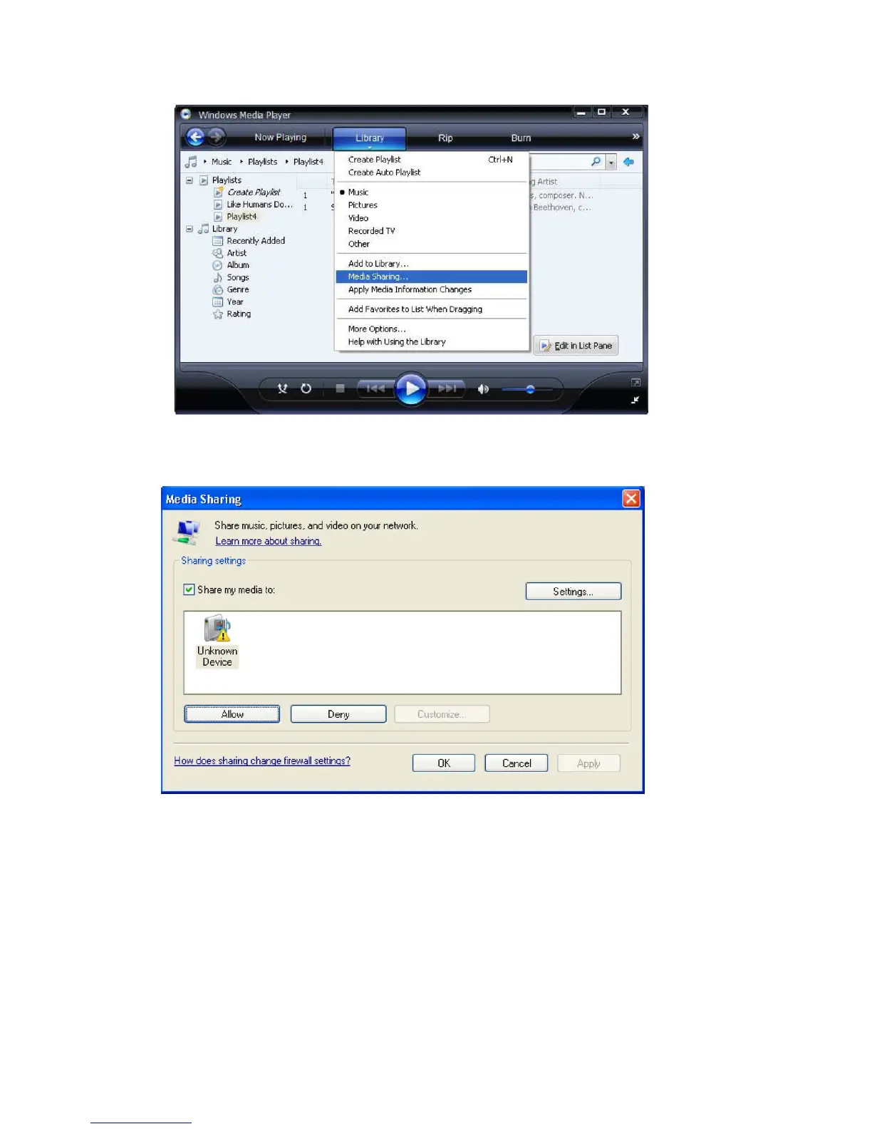5. From the ‘Media Sharing’ windows, the radio will be listed as an unknown device. Click on the unknown device