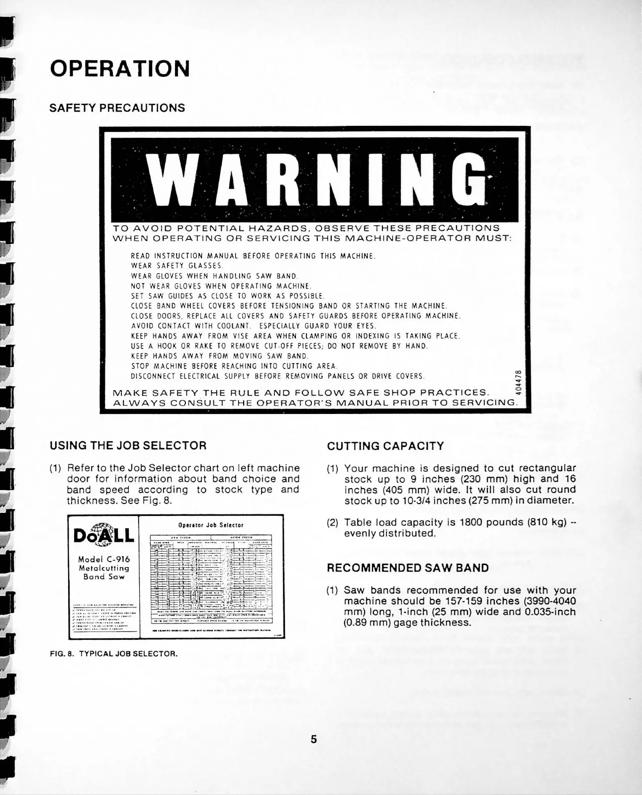 DoAll C-916 - Operation; Safety Precautions; Using the Job Selector; Cutting Capacity