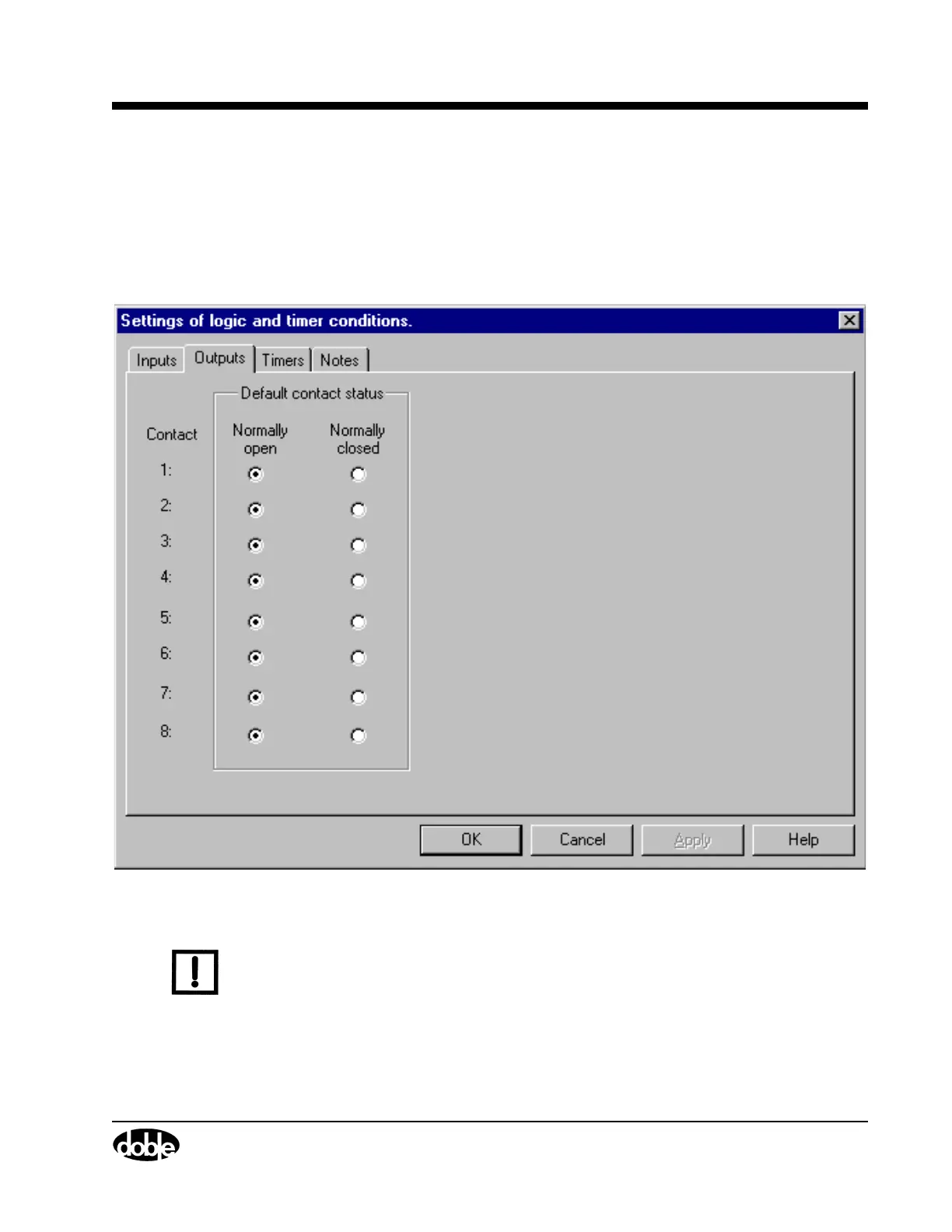 default contact status for all eight logic outputs in the Outputs tab. Click