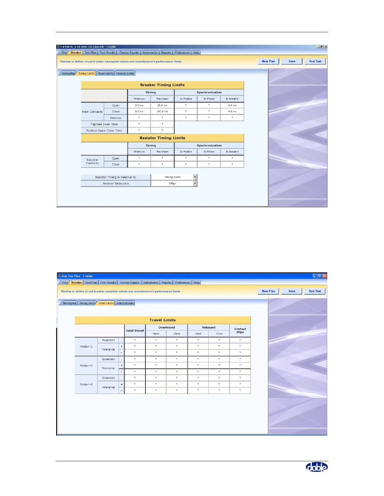 doble TDR900 - Figure 24. Breaker - Timing Limits Sub-Tab; Figure 25. Breaker - Travel Limits Sub-Tab