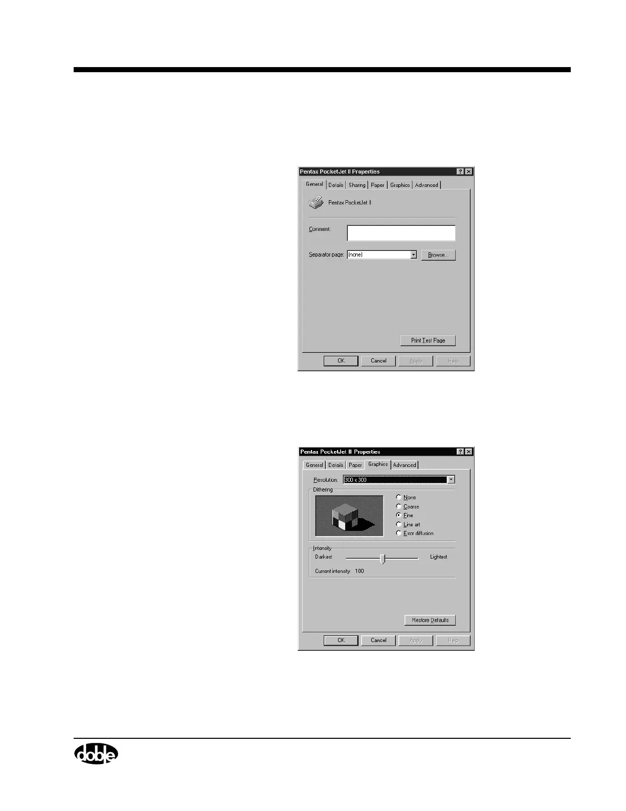 The Pentax PocketJet II Properties window appears, as shown in