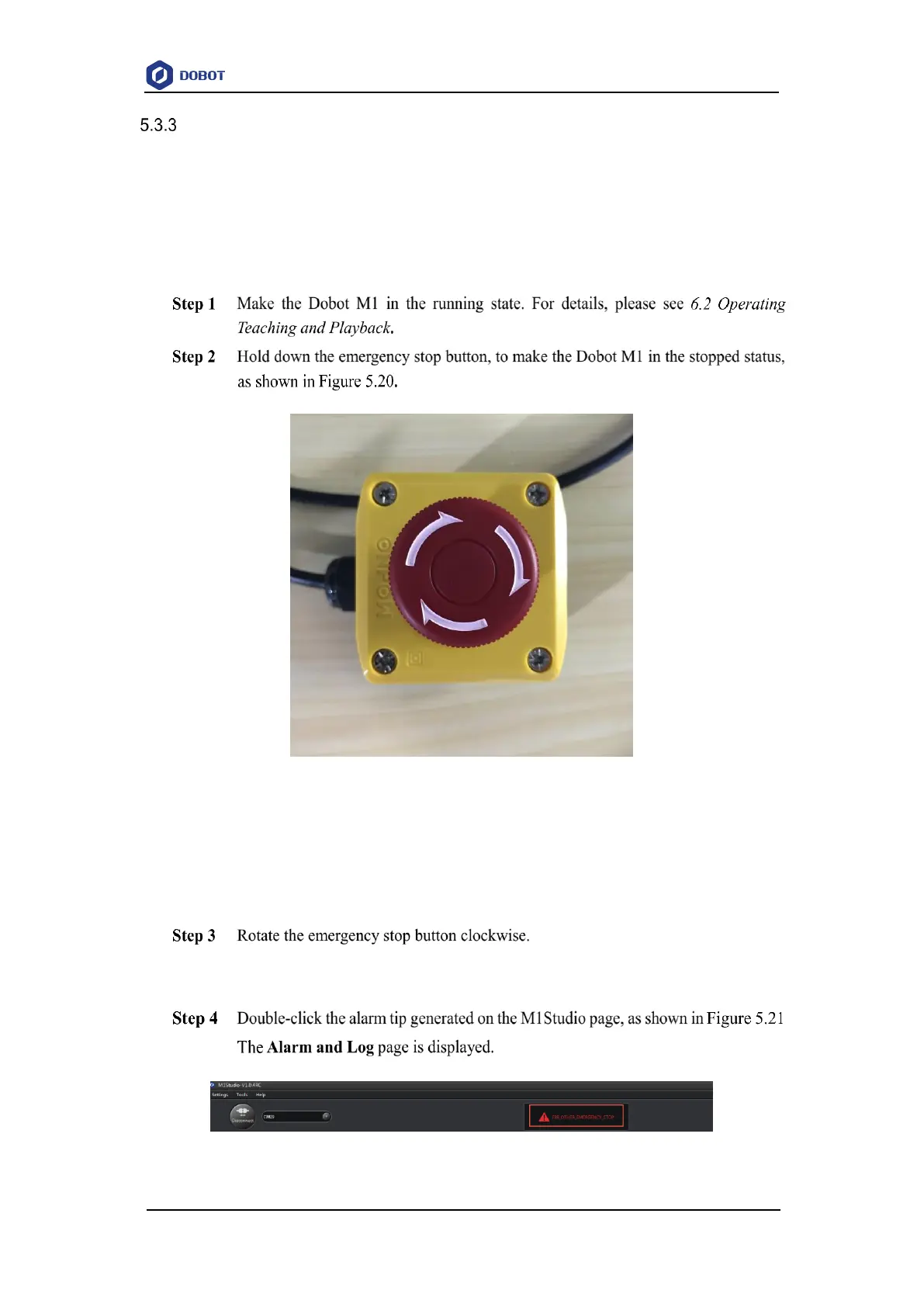 Dobot M1 is stopped immediately with an alarm about emergency stop and the red
