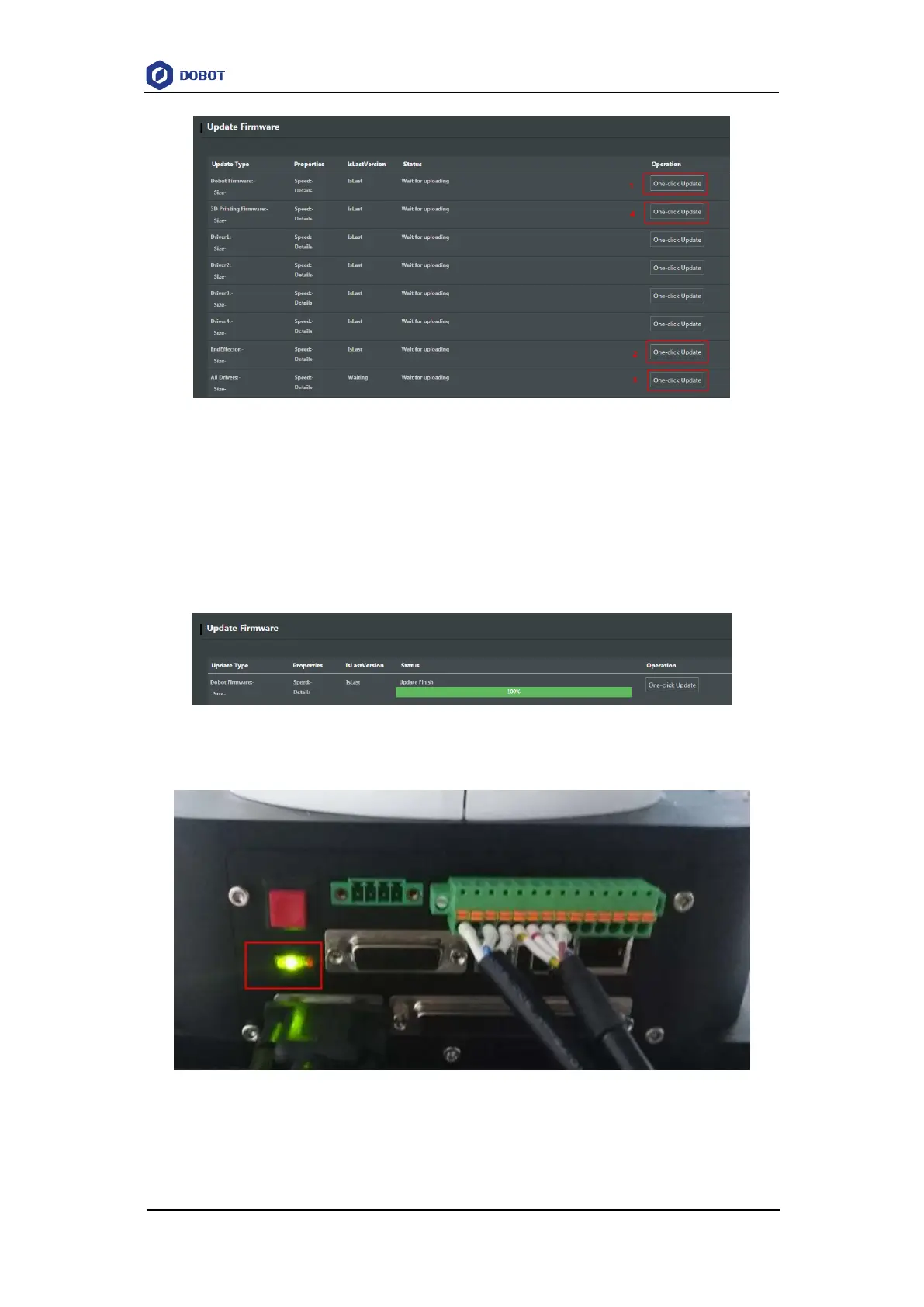 the green LED indicator on the base of Dobot M1 is blinking, the update is