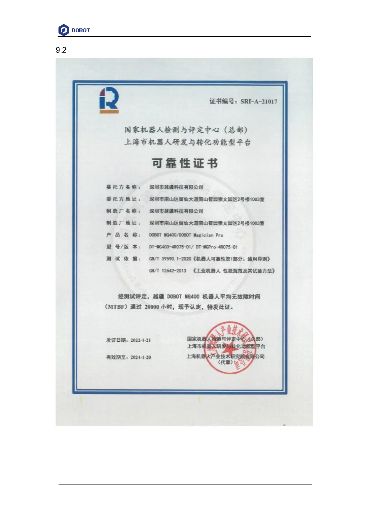Dobot MG400 - Robot Reliability Certification