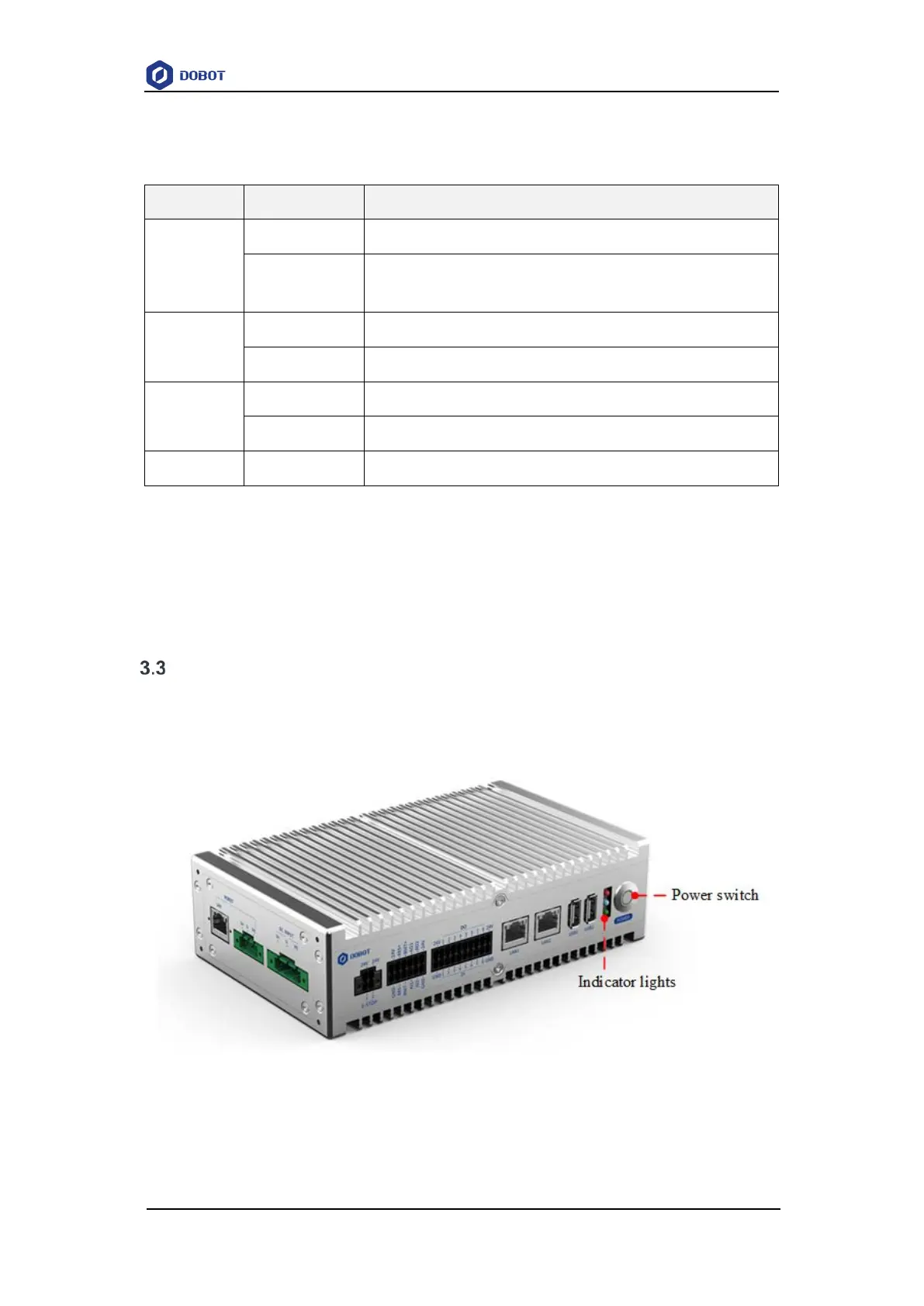 The definition of the indicator lights of the robot arm is shown in Table 3.2.