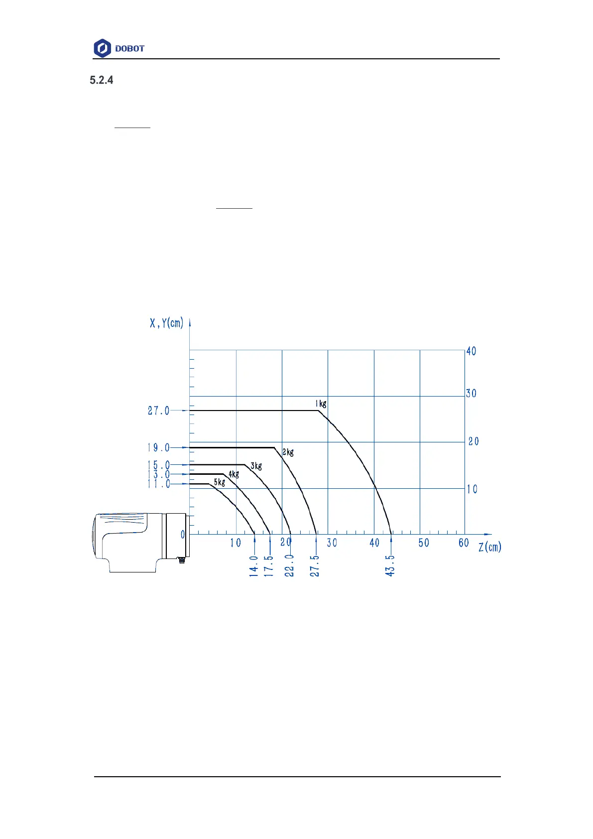 the abscissa Z[cm] represents the distance from the gravity center of the load to the robot flange in