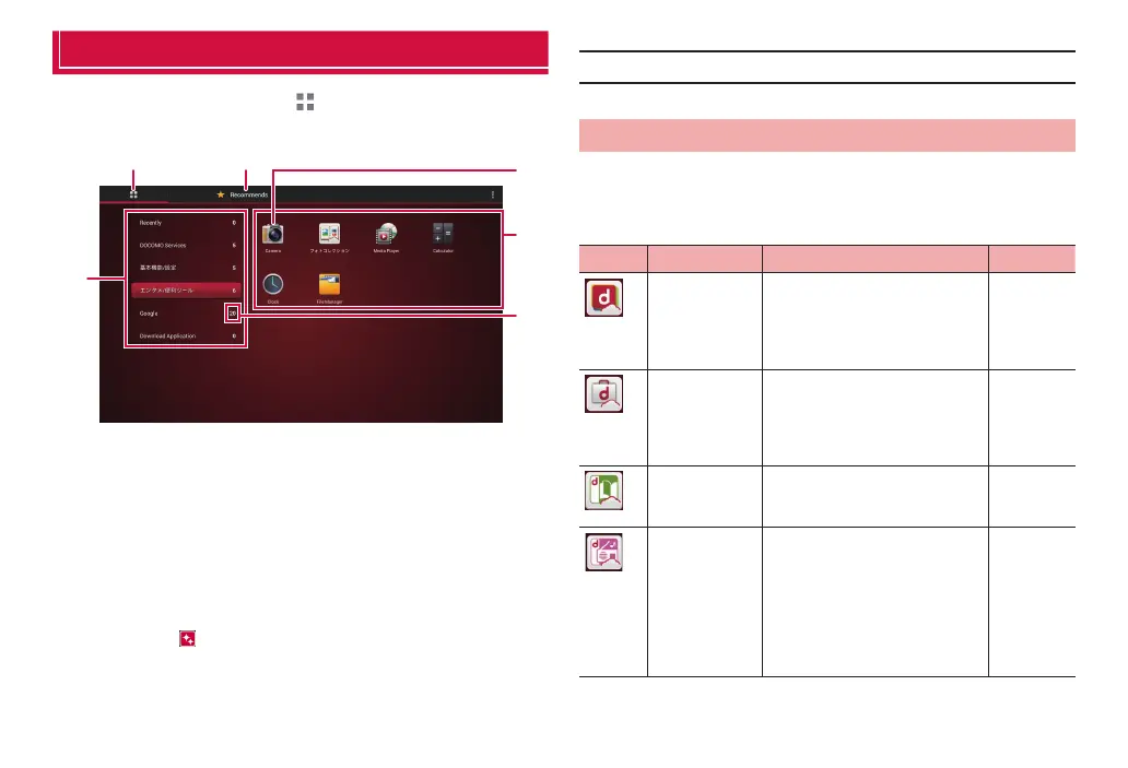 Applications displayed in the default Application screen are as follows.