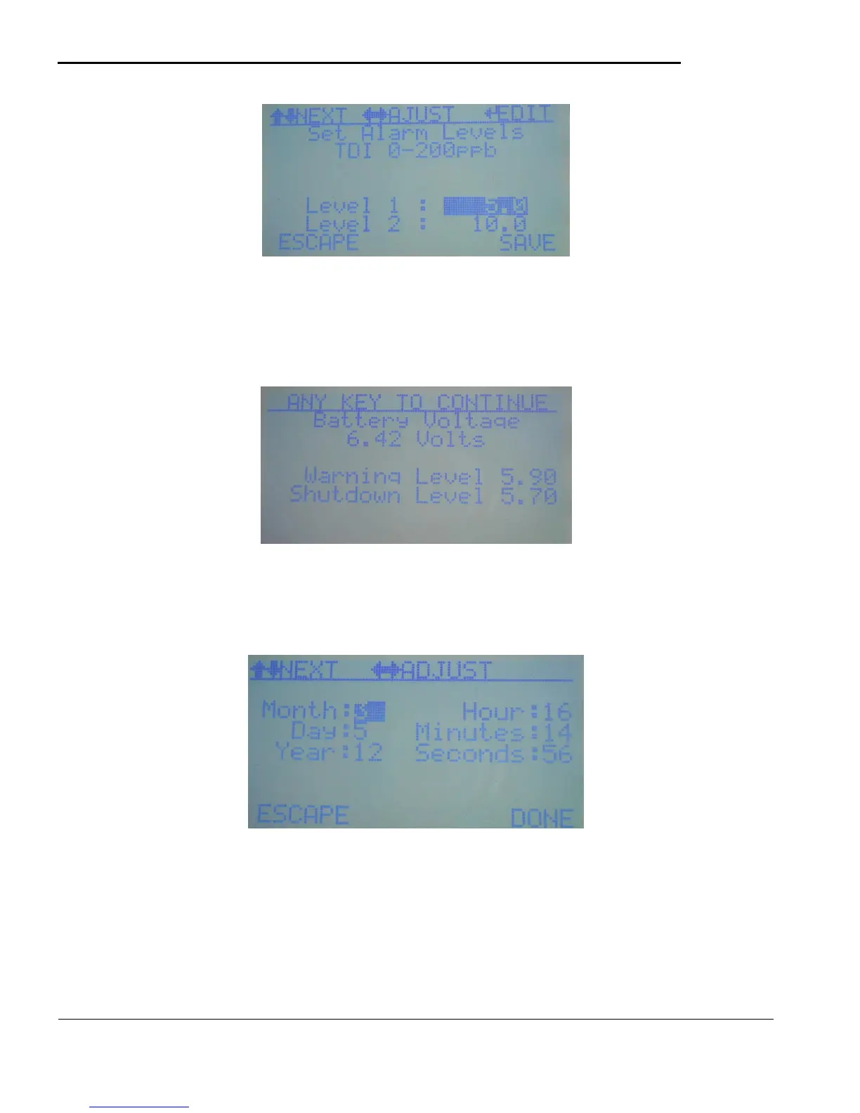 voltage along with the warning and shutdown levels. These levels can be adjusted if necessary (not