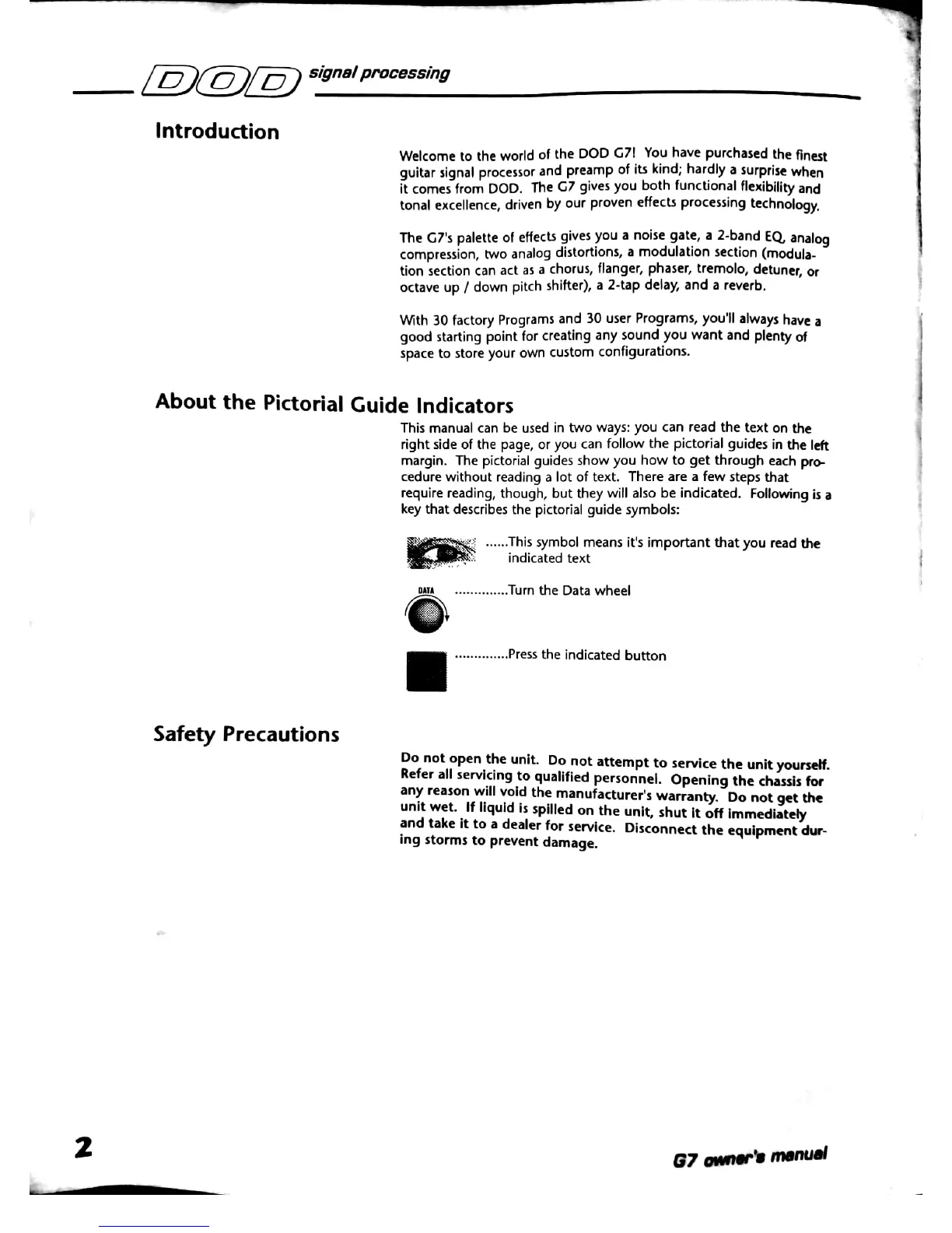 DOD G7 - Introduction to DOD G7 Guitar FX Processor;Preamp; Understanding Pictorial Guide Indicators; General Safety Precautions