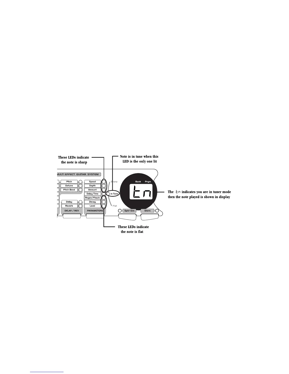 in tune when the In Tune LED is lit. The LEDs above the In Tune LED indicate that you are sharp and need to