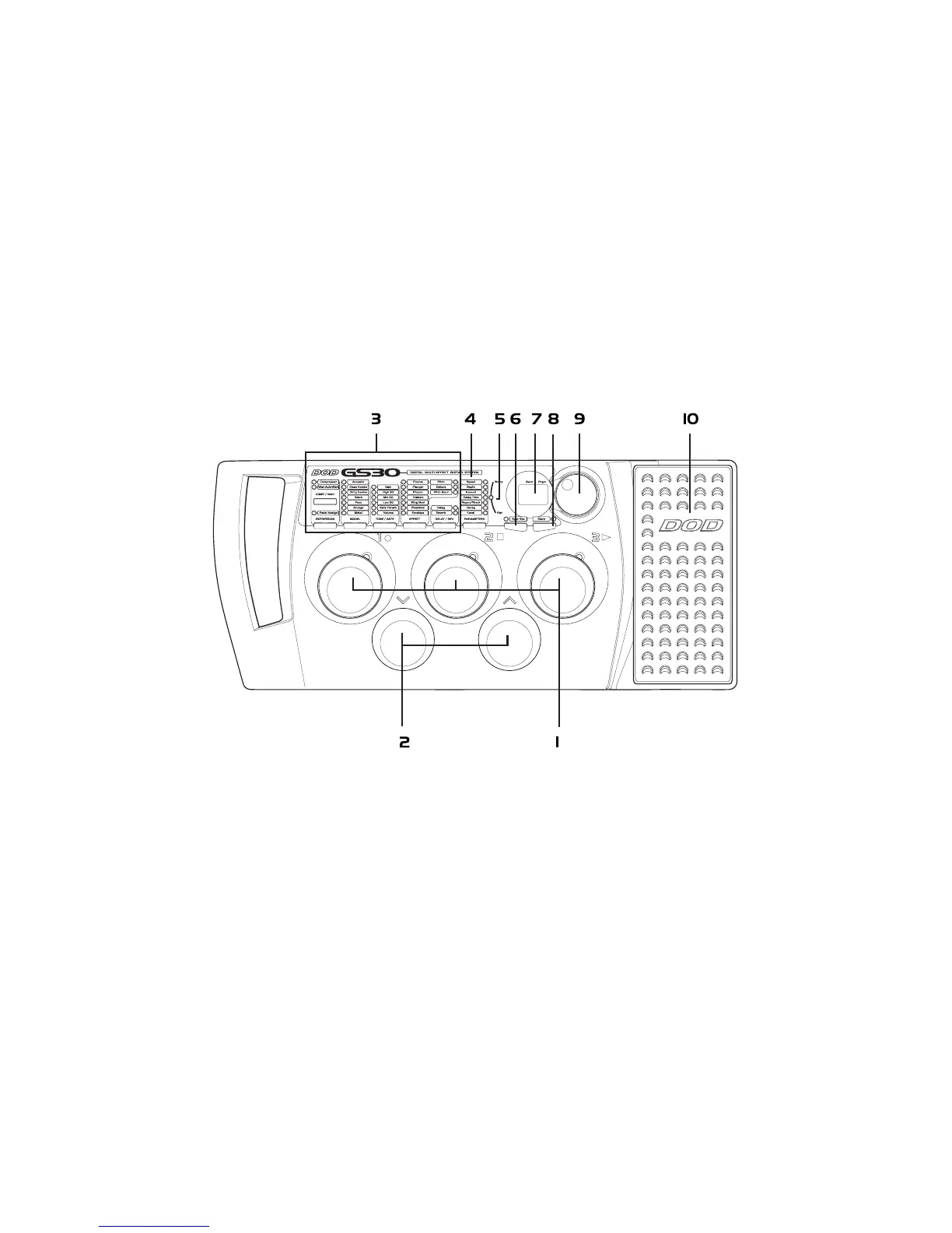 Program Footswitches - These switches provide access to the GS30 user presets. They are also