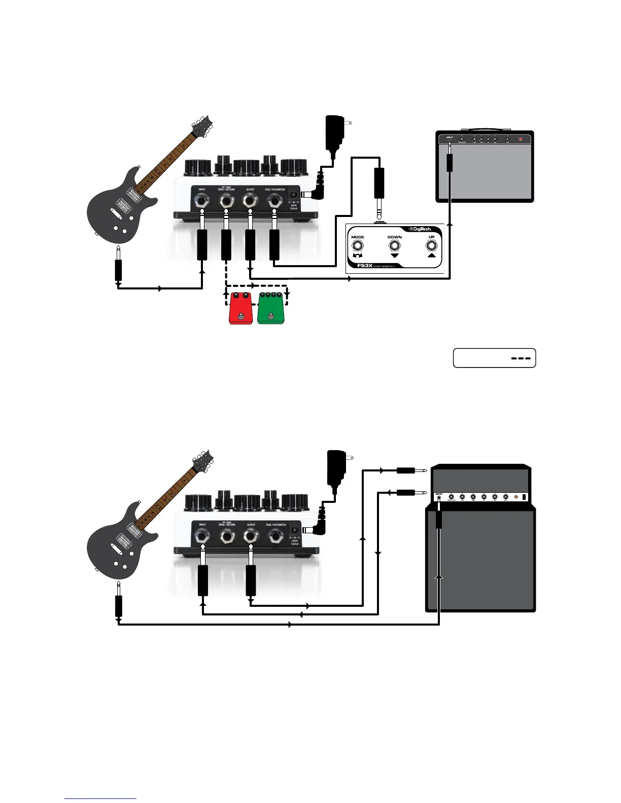 DOD rubberneck - Connection Diagrams; Amplifier In-Line Setup Diagram; Amplifier Effects Loop Setup Diagram