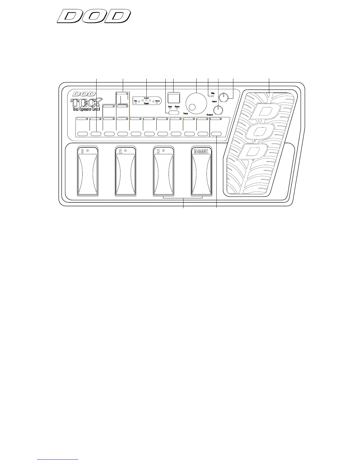 1) PROGRAM and BANK SELECTOR FOOTSWITCHES - These footswitch-