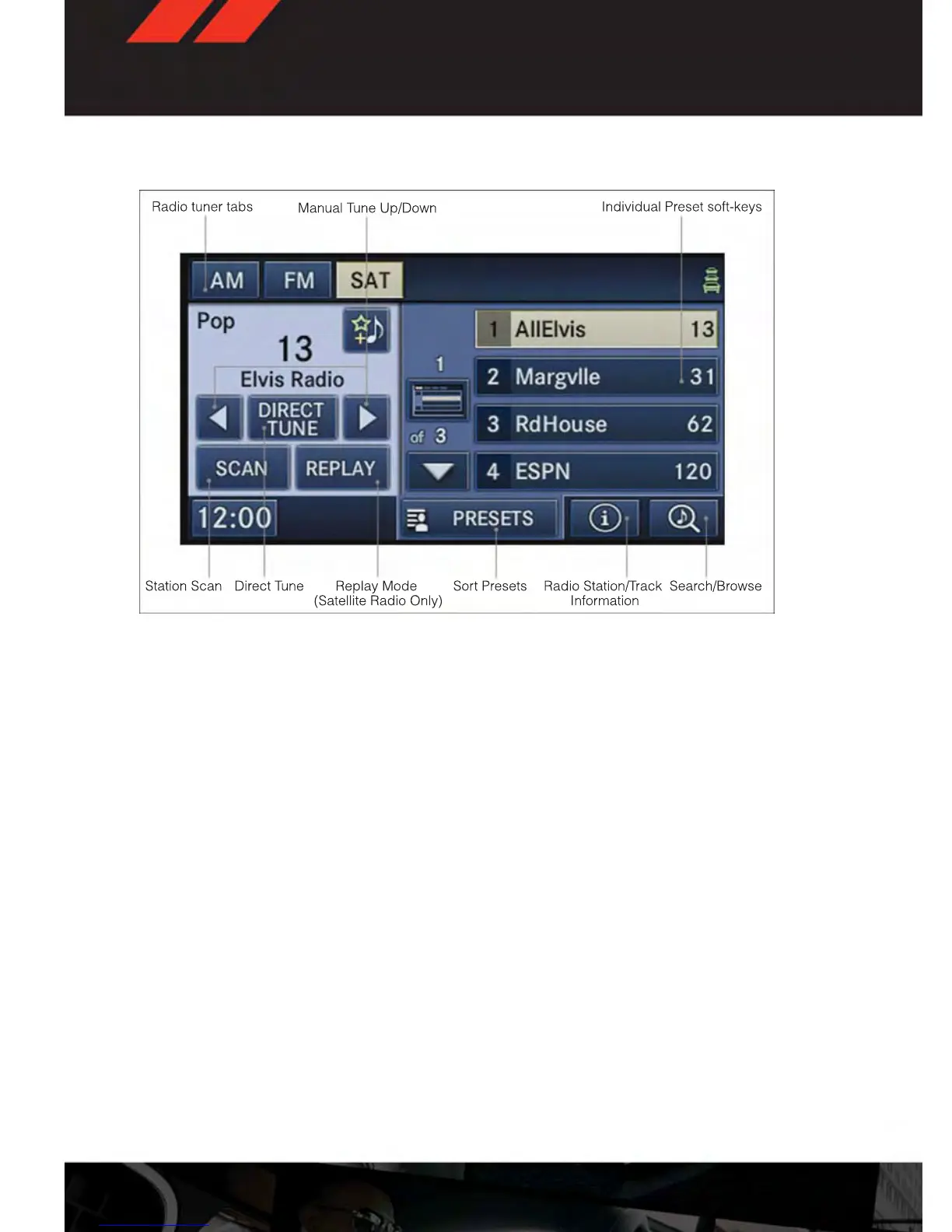 • Select the radio band by touching either the “AM,” “FM,” or “SAT” soft-key.