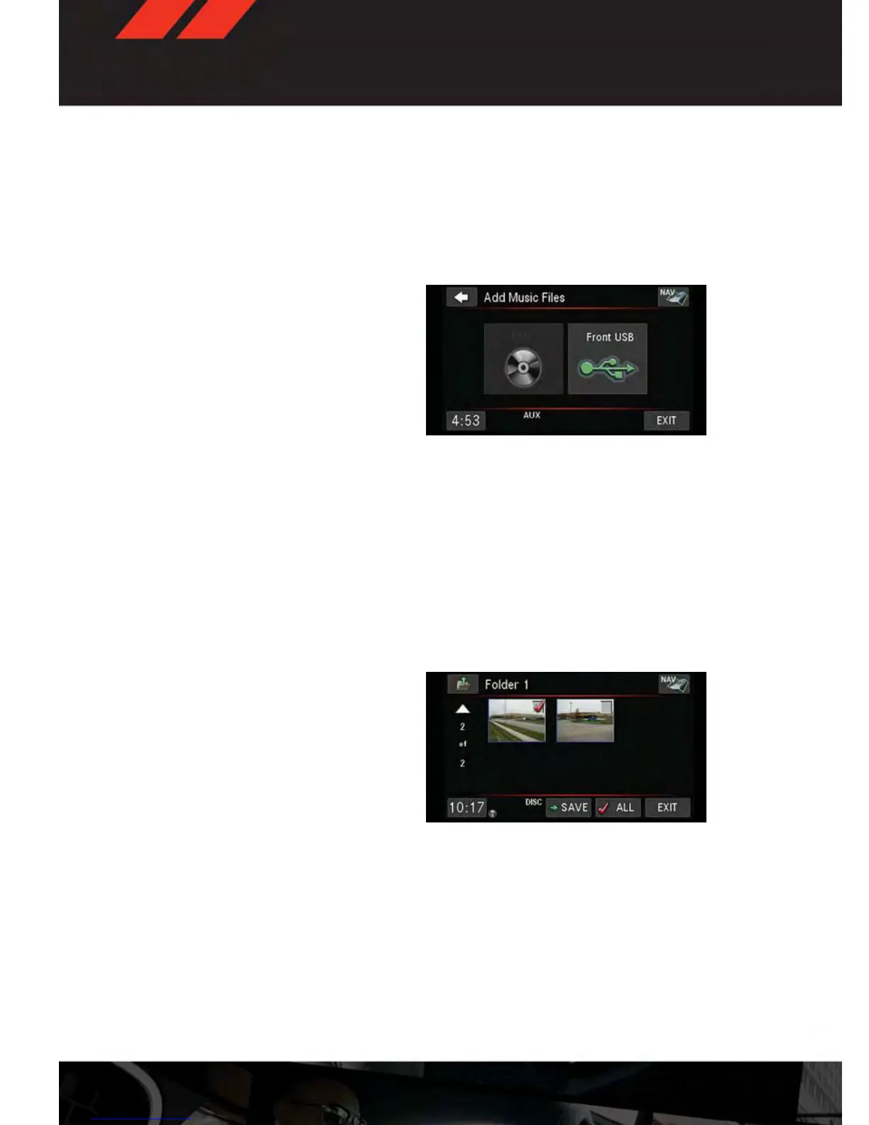 • Touch the “Disc” or “USB” soft-key, then select the folders or pictures you wish to copy to