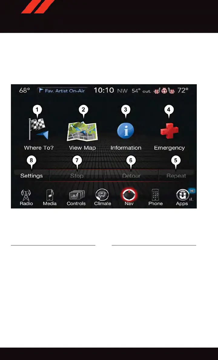 From the main Navigation menu, press the “Where To?” button on the touchscreen, then