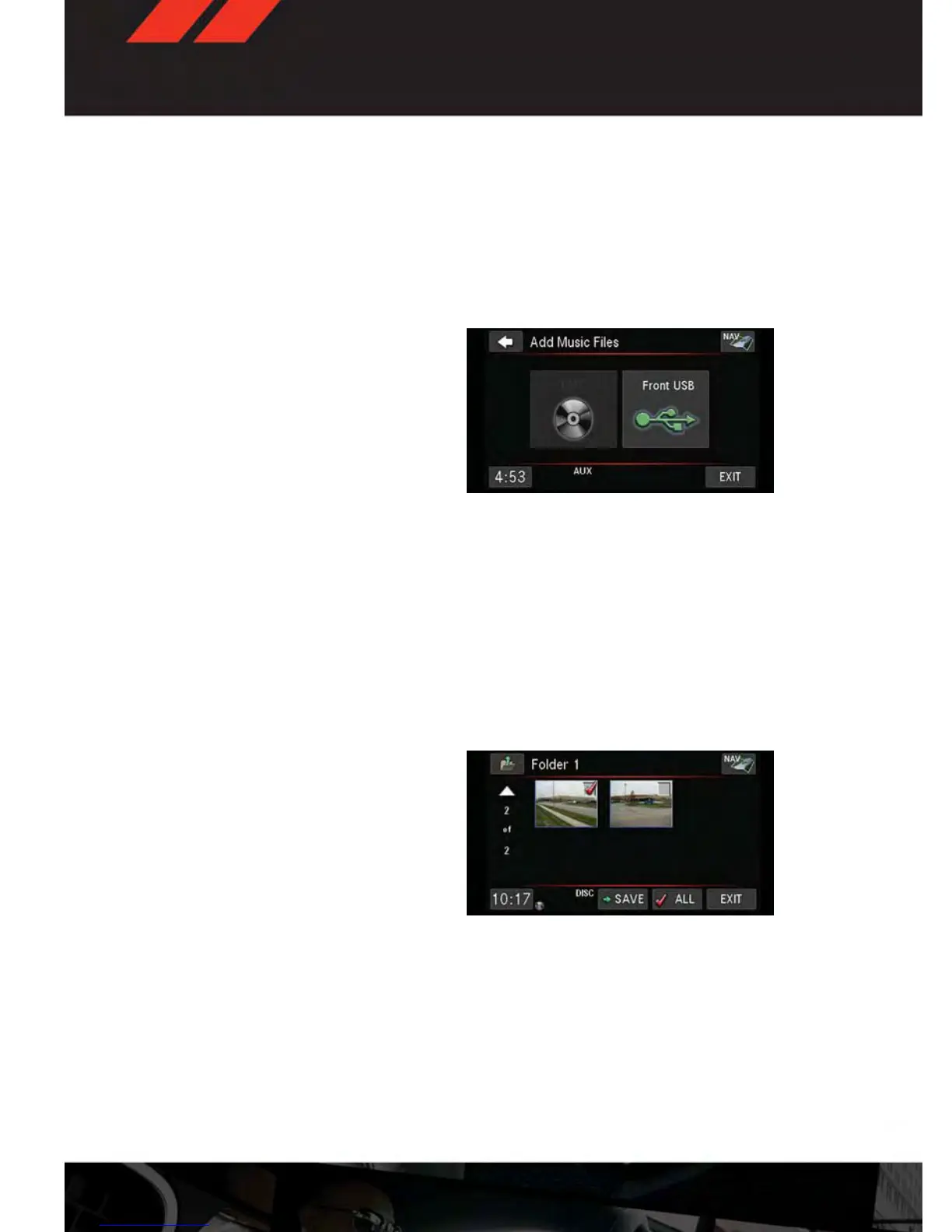 • Touch the “Disc” or “USB” soft-key, then select the folders or pictures you wish to copy to
