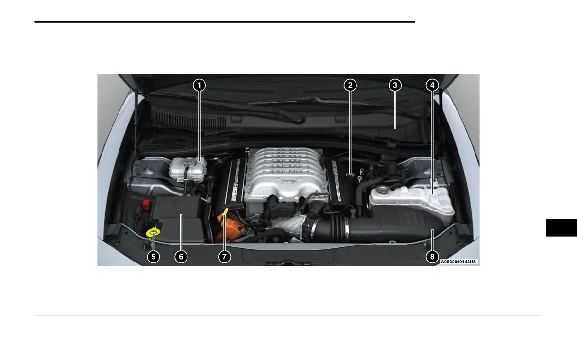 3 — Brake Fluid Reservoir Access Cover 7 — Engine Oil Dipstick
