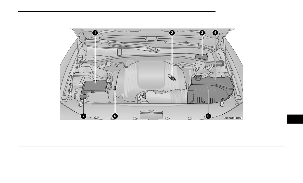 3 — Brake Fluid Reservoir Access Cover 7 — Washer Fluid Reservoir Cap