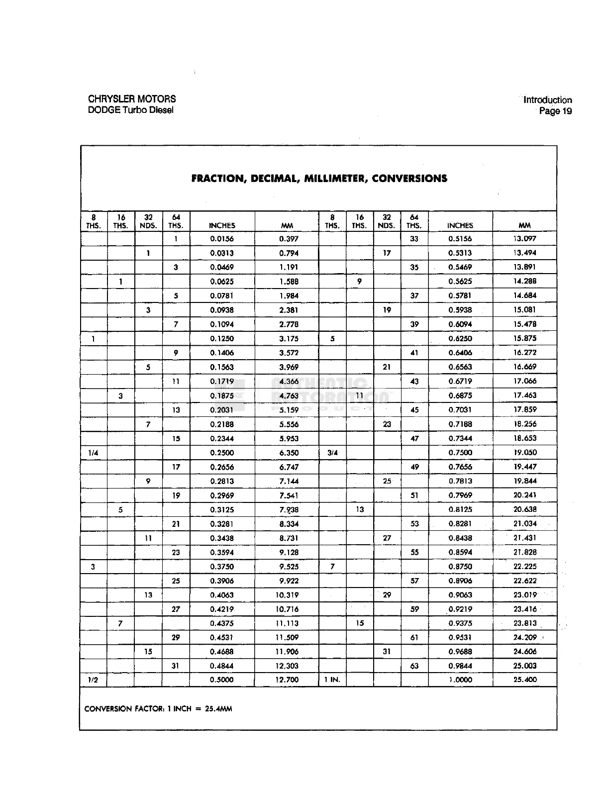 Dodge D250 1990 - Fraction, Decimal, Millimeter, Conversions