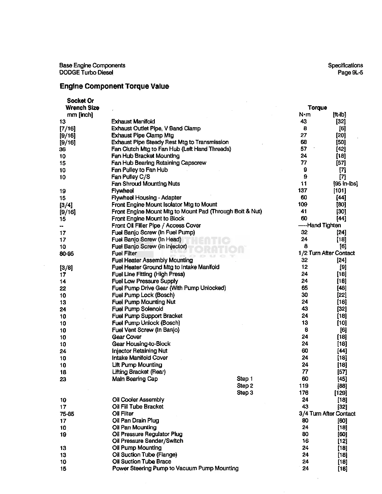 Engine Component Torque Value