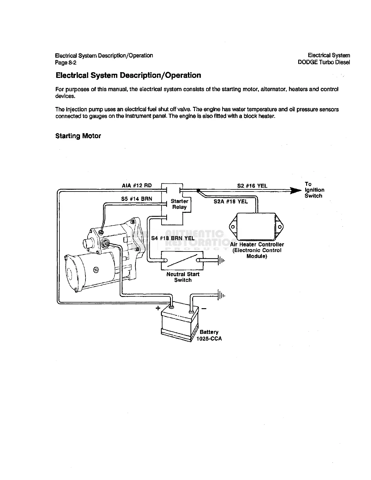 For purposes of this manual, the electrical system consists of the starting motor, alternator, heaters and control
