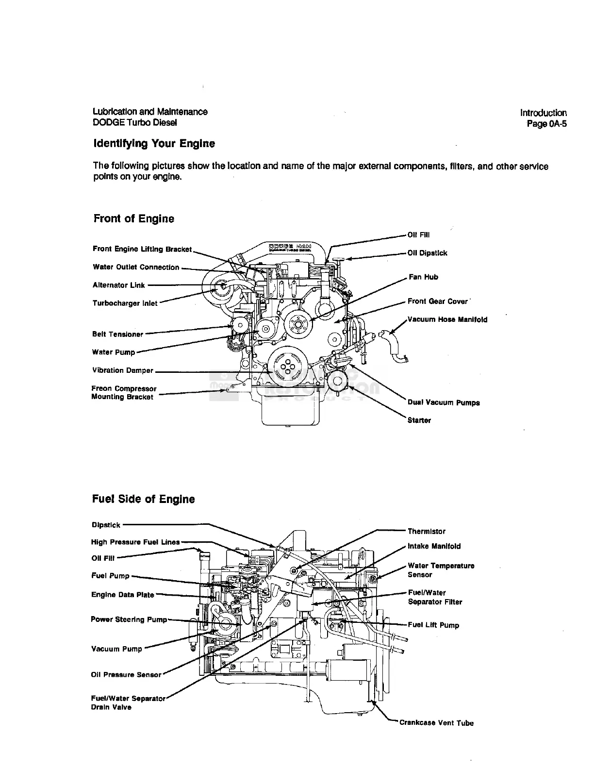 Dodge D350 1990 - Engine View and Parts Identification; Front of Engine; Fuel Side of Engine; Identifying Your Engine
