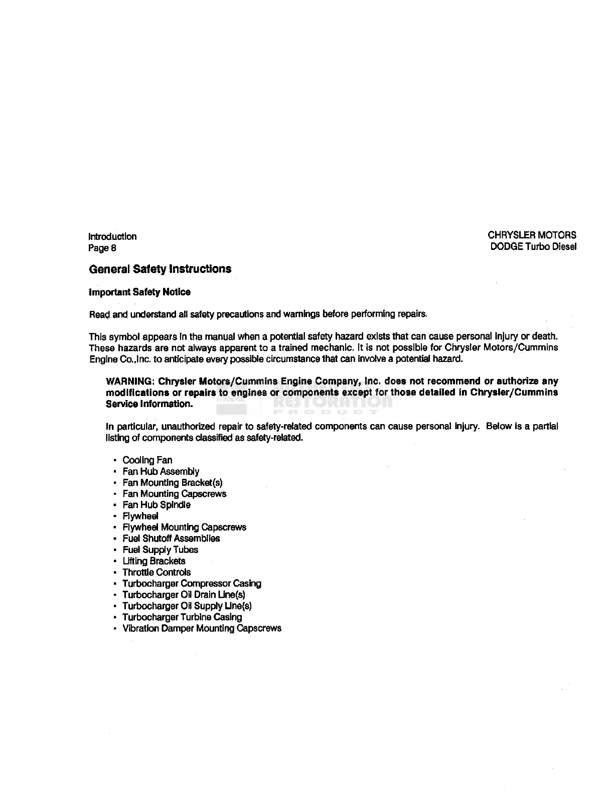 modifications or repairs to engines or components except for those detailed in Chrysler/Cummins