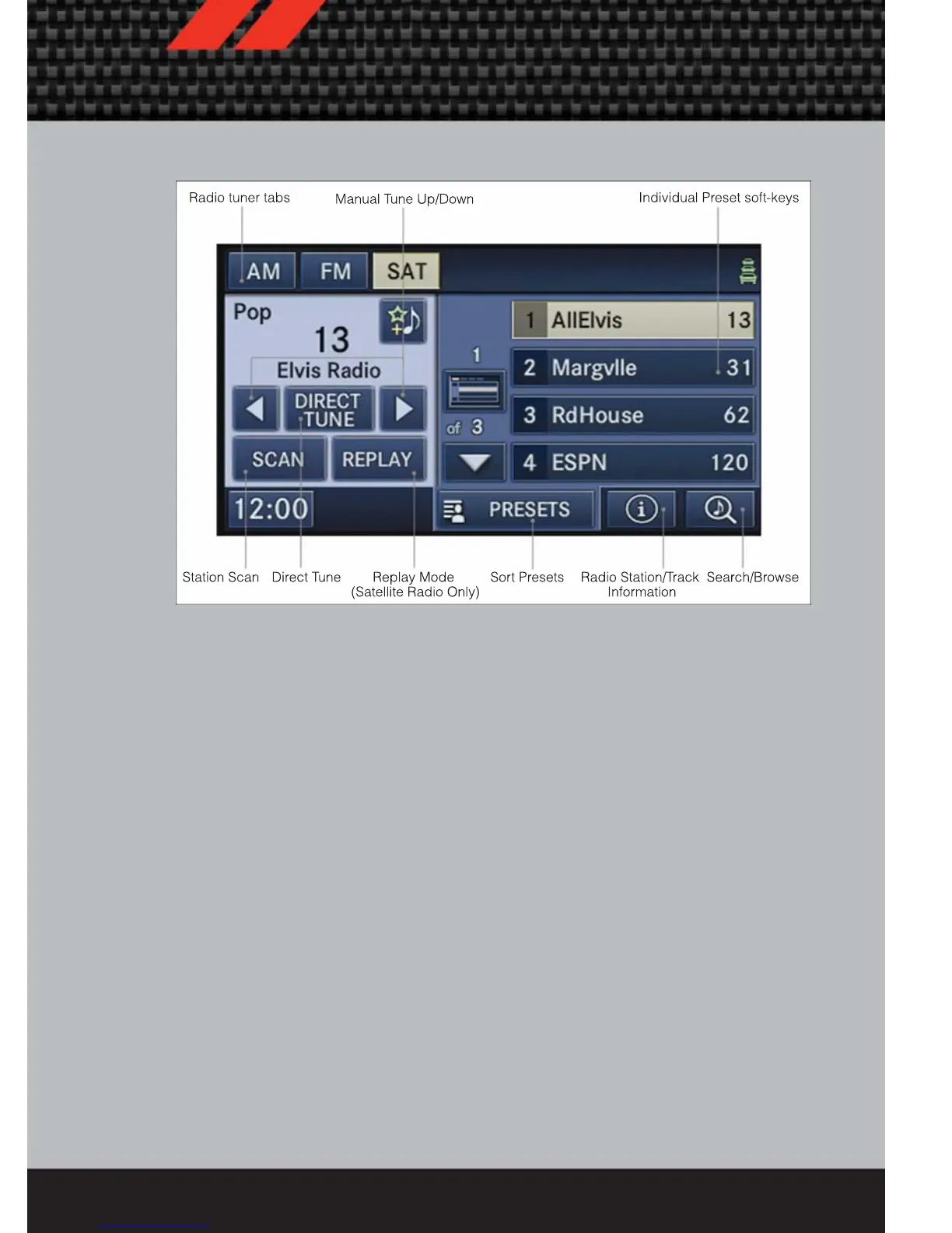 • Select the radio band by touching either the “AM,” “FM,” or “SAT” soft-key.
