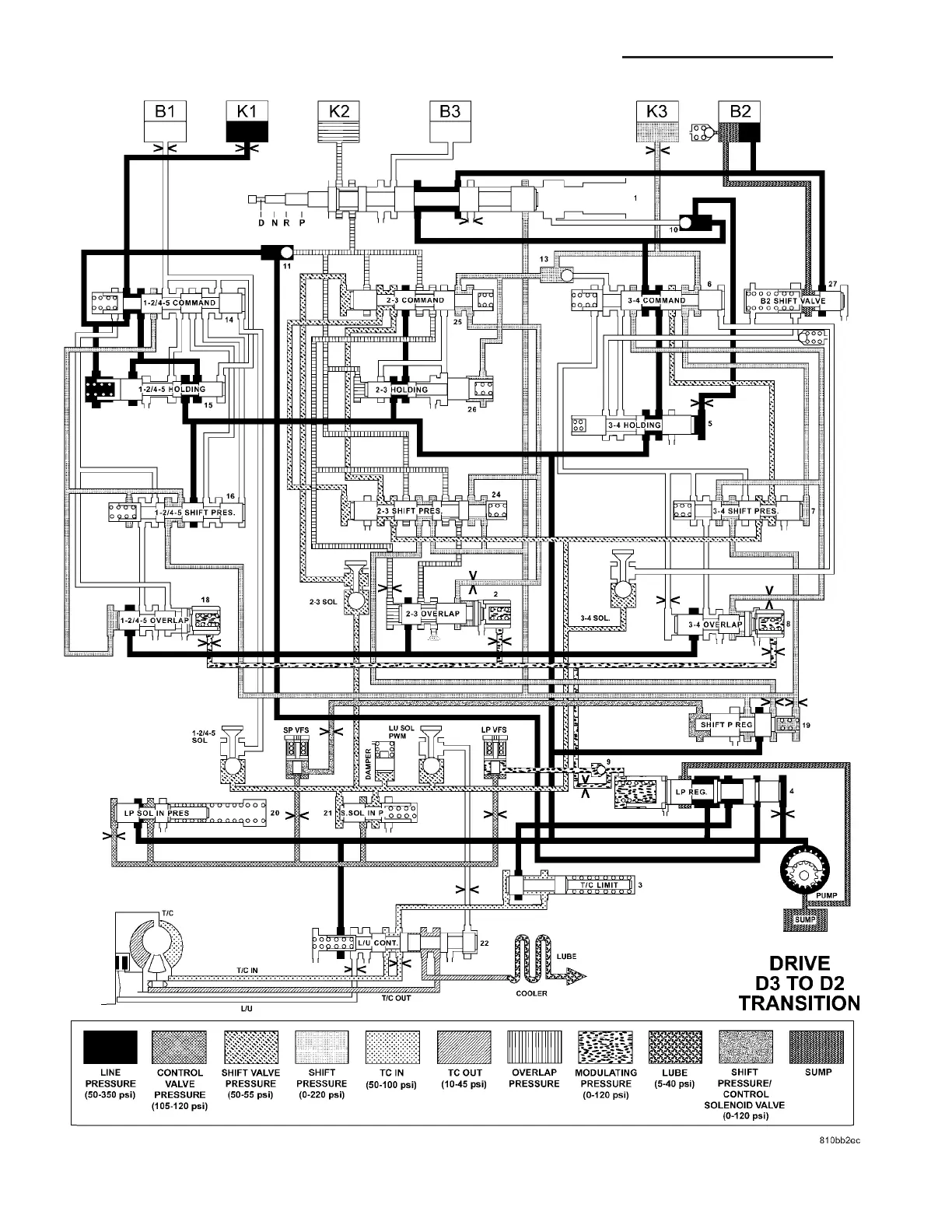 HYDRAULIC FLOW IN DRIVE - THIRD TO SECOND GEAR TRANSITION
