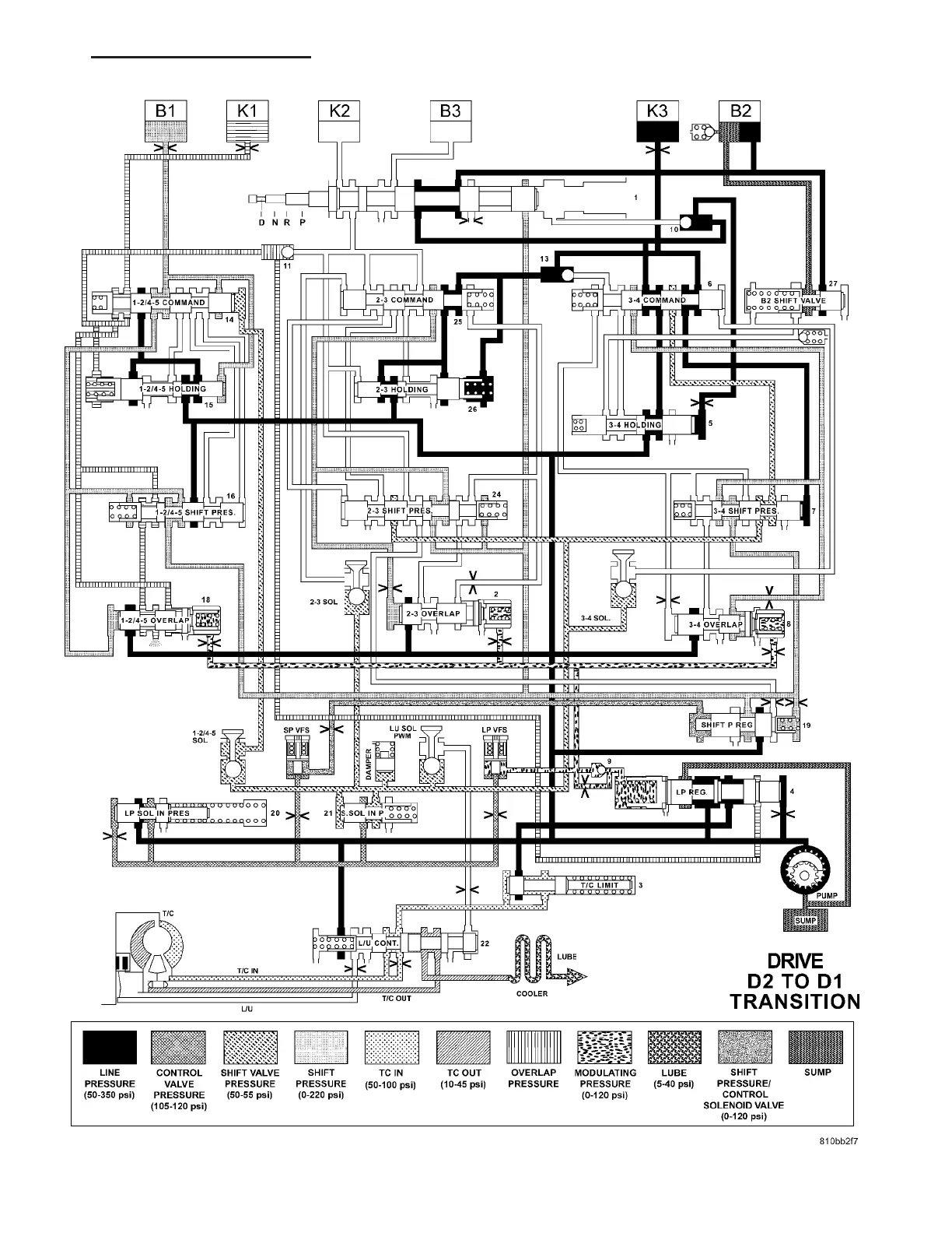 HYDRAULIC FLOW IN DRIVE - SECOND TO FIRST GEAR TRANSITION