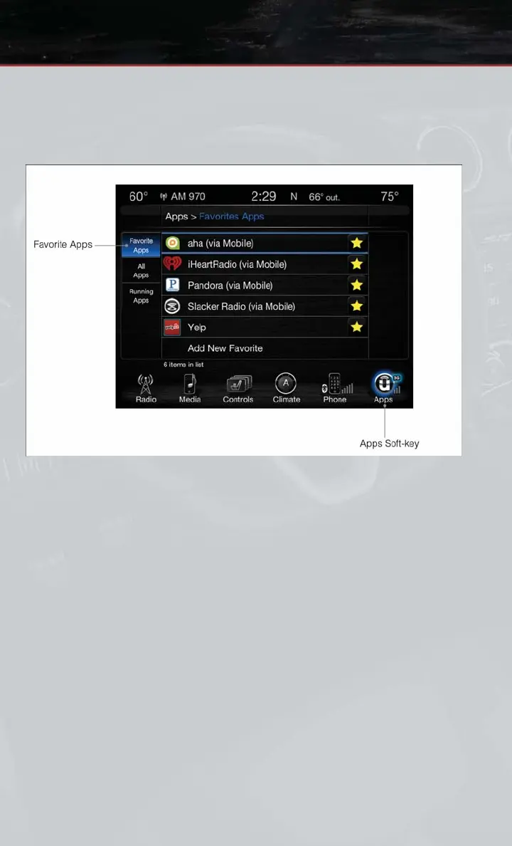 • If equipped, the Via Mobile apps can be found by selecting the “Apps” soft-key in the