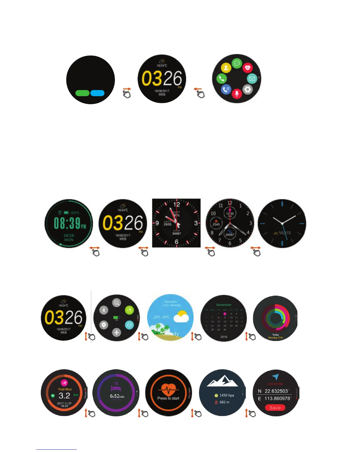 1.3.1 When on main screen, swipe left or right to enter sub screens.
