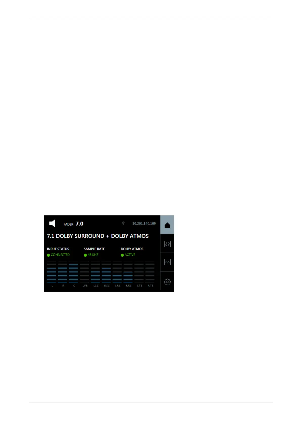 screen with the current fader setting, IP address, input status, sample rate, and audio meter, and for the