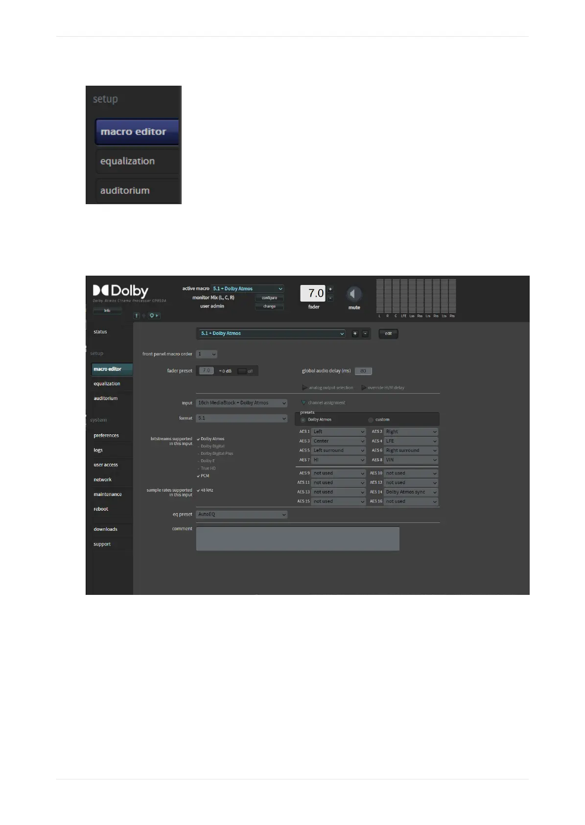 When using the 8x AES IN connector, there are two macro input options and a third for Dolby Atmos: