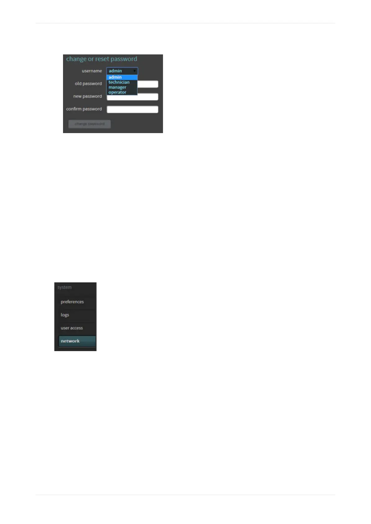 • admin: Access all technician‐level tasks, and change the operator‐, manager‐, and technician‐level