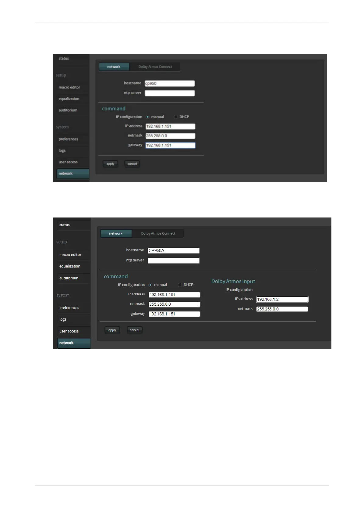 The CP950A has an additional configuration. You can enter the Dolby Atmos input port network settings, as