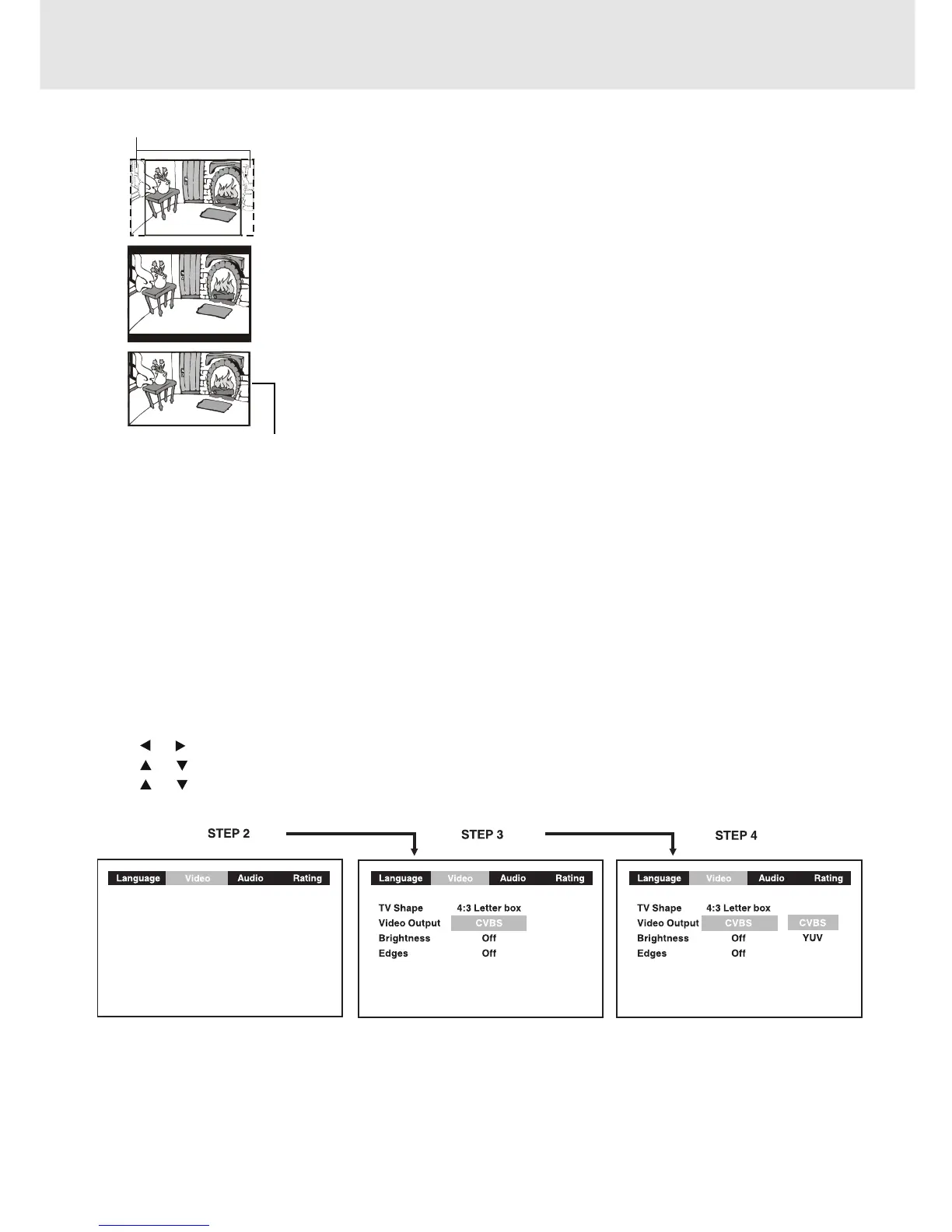 Always set Video Output in CVBS, otherwise, the picture on the TV may be distorted. If this occurs, and you cannot
