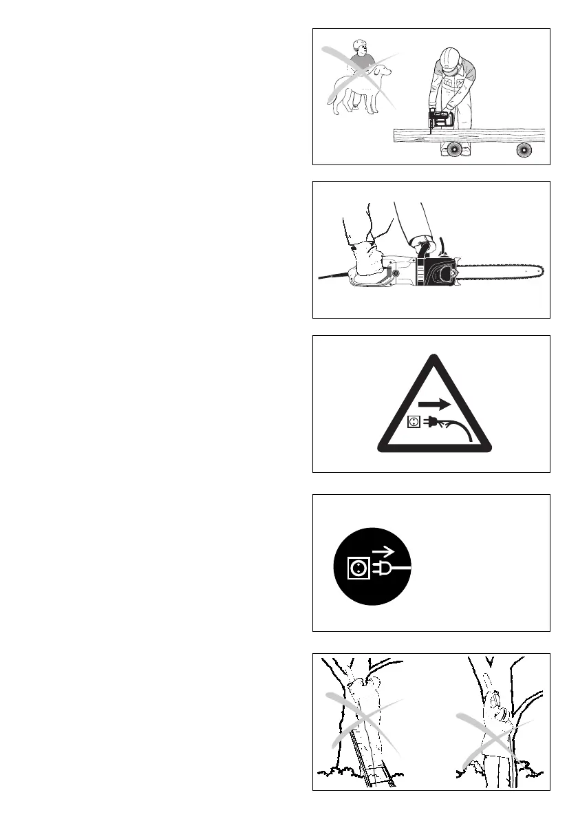 - Never climb up into trees to perform sawing with the electric chain
