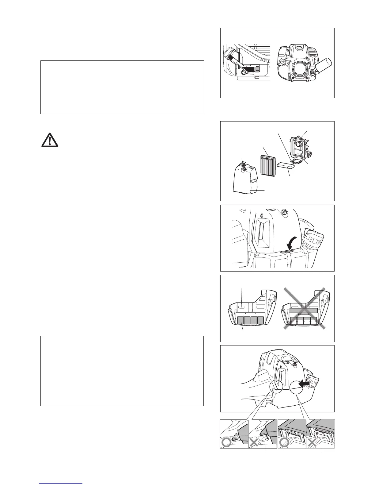 Introduceţi cârligul lateral pe capacul ltrului de aer în modul ilustrat şi apăsaţi –