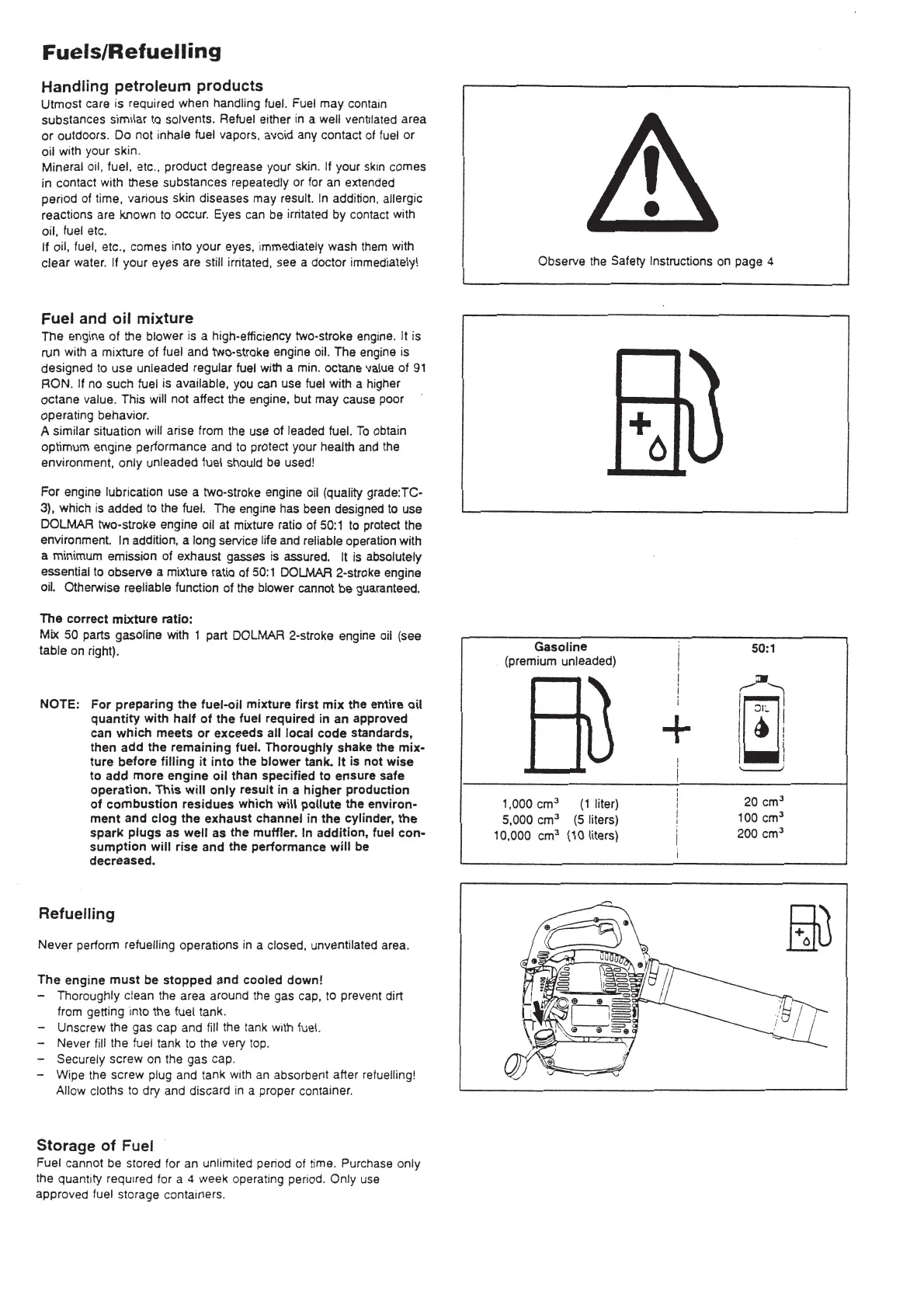 Dolmar PB-250 - Fuels and Refuelling; Handling Petroleum Products; Fuel and Oil Mixture; Refuelling Procedure